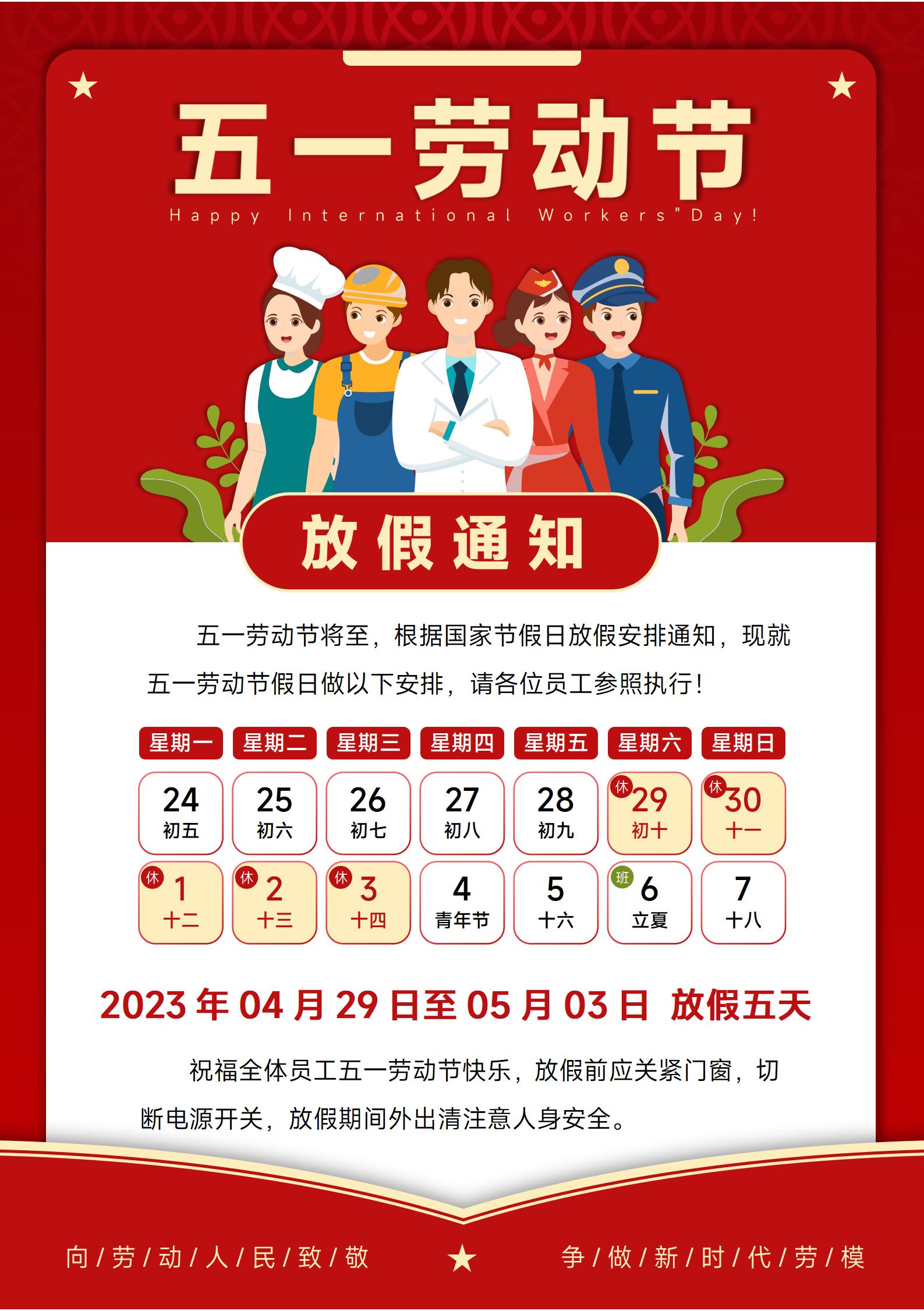 五一勞動(dòng)節(jié)將至,根據(jù)國(guó)家節(jié)假日放假安排通知,現(xiàn)就五一勞動(dòng)節(jié)假日做以下安排,請(qǐng)各位員工參照?qǐng)?zhí)行!