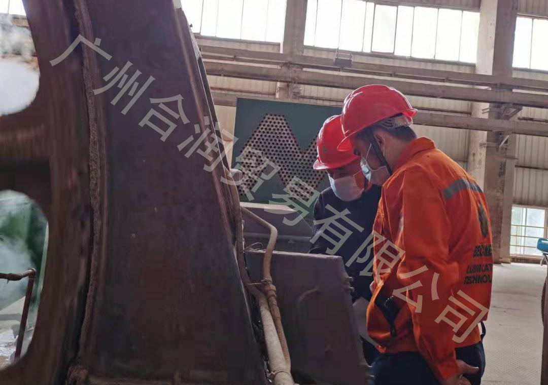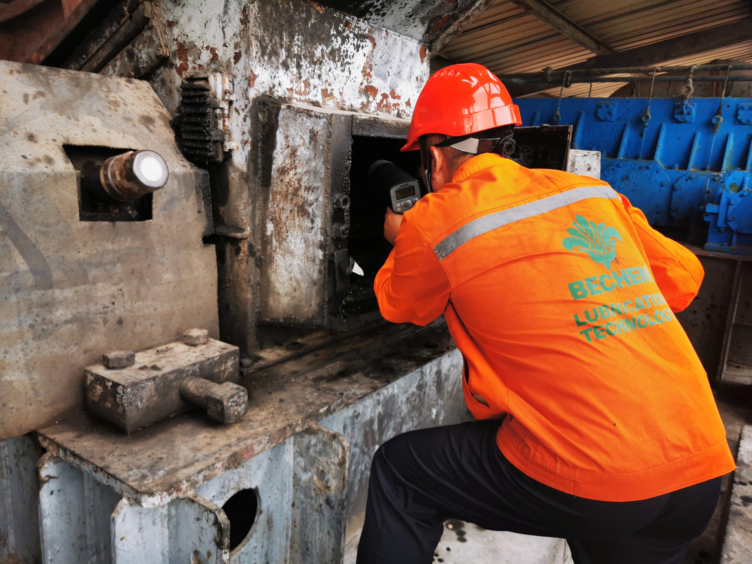 在貴公司設備部工程師的陪同下,對貴廠磨機的潤滑狀況做了檢測。 打開磨機的觀察口在頻閃儀下觀察大小齒輪工作齒面情況,大小齒輪工作面已被油膜覆蓋,大小齒輪的工作齒面沒發現有磨損現象和磨損痕跡,油位有些偏低,需要添加些潤滑油使油面沒過小齒輪的四個齒為益,這樣能讓油膜形成得更厚粘附性更好會使潤滑油發揮到最佳潤滑效果,對大小齒輪起到更好的保護。 齒面溫度比較正常,大小齒輪溫差在合理范圍,大小齒輪的載荷面積正常,密封做...