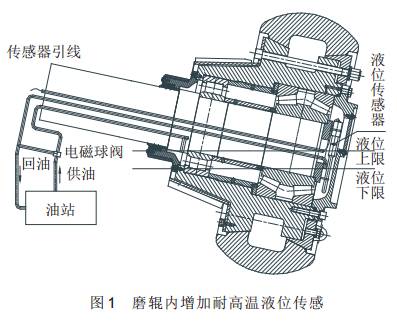 為此,在磨輥密封和磨輥潤滑系統(tǒng)很難有效改進(jìn)的情況下,我公司從控制磨輥內(nèi)油位入手,在磨輥內(nèi)增加了一個(gè)耐高溫的液位傳感器,見圖1。達(dá)到了很好的效果。安裝在磨輥軸承壓蓋上的液位傳感器引線從磨輥軸中引出,并在油站供油管路上增加了一個(gè)三通的電磁球閥,常開點(diǎn)與磨輥供油管路相連,常閉點(diǎn)與回油管路相連。