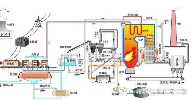 基本生產過程是:燃料在燃燒時加熱水生成蒸汽,將燃料的化學能轉變成熱能;蒸汽壓力推動汽輪機旋轉,熱能轉換成機械能;然后汽輪機帶動發電機旋轉,將機械能轉變成電能。
