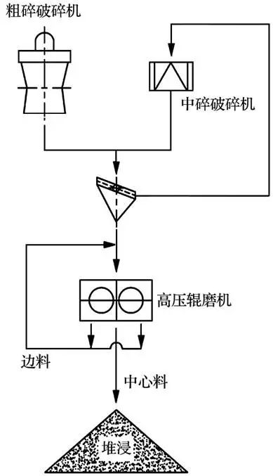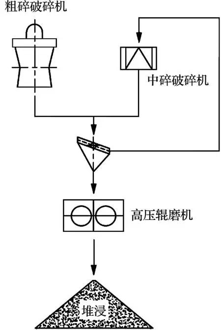 圖1 所示為高壓輥磨機(jī)常用的兩種堆浸工藝。高壓輥磨產(chǎn)品分為邊料和中心料,邊料粒度相對(duì)較粗,產(chǎn)生的微裂紋較少。高壓輥磨機(jī)開(kāi)路工藝回收率較邊料返回工藝低,但前者的工藝流程簡(jiǎn)單,設(shè)備規(guī)格相對(duì)較小,投資與運(yùn)行成本較低。