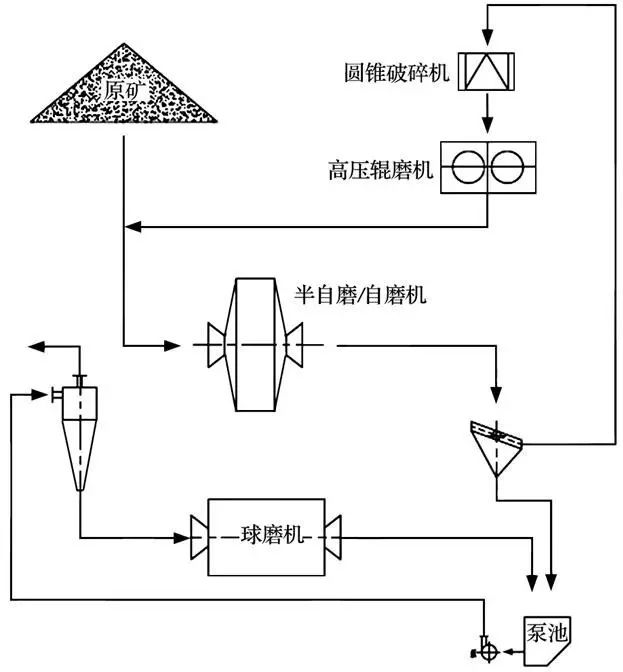高壓輥磨機(jī)邊料返回破碎工藝是指高壓輥磨中間產(chǎn)品直接進(jìn)入下道作業(yè)工序,邊料再返回高壓輥磨機(jī)再次破碎的工藝。輥壓后中間產(chǎn)品可以直接進(jìn)入球磨機(jī)磨礦,也可以先進(jìn)行分級(jí),粗粒產(chǎn)品進(jìn)入球磨機(jī)磨礦。此工藝在輥壓產(chǎn)品細(xì)粉含量較高時(shí)優(yōu)勢(shì)明顯。