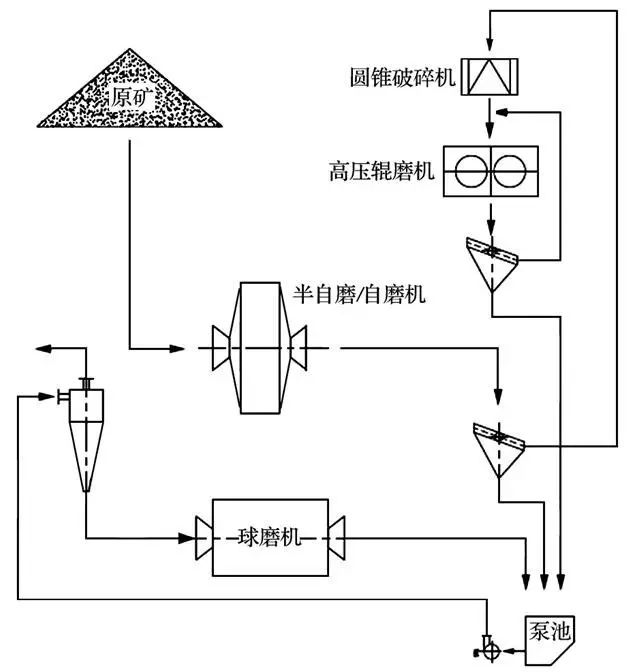 高壓輥磨機(jī)干式篩分需要配置打散機(jī),對(duì)輥壓機(jī)料餅進(jìn)行打散,否則篩分效率會(huì)大大降低。此外,由于整個(gè)流程采用干式磨礦、干式篩分和干式選別,因此對(duì)物料水分含量要求較高,不宜處理含水量較高的物料,同時(shí)還要注意防塵工作,需配備除塵設(shè)備等。該流程主要應(yīng)用于非金屬礦和含泥少的礦石,以及缺水、干旱地區(qū)。