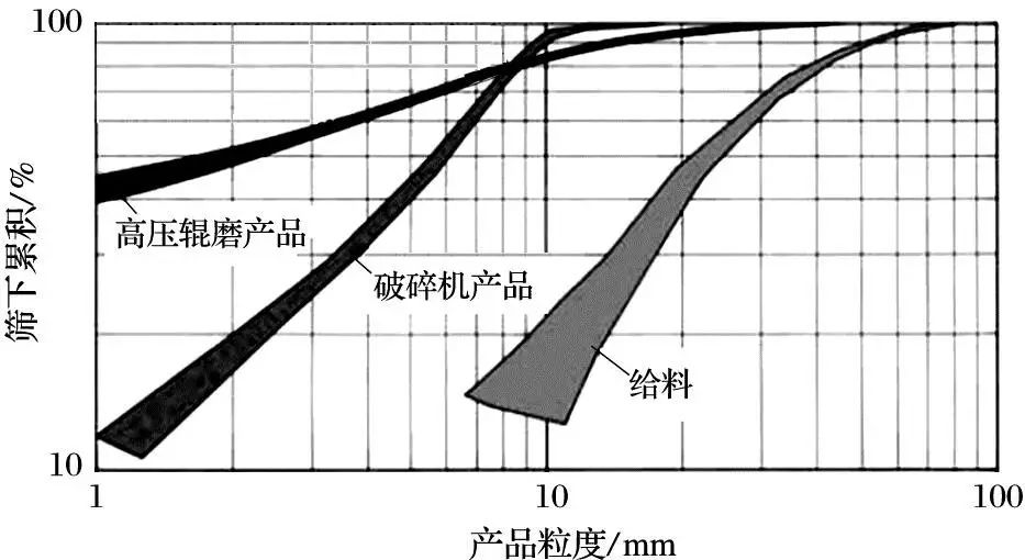 圖3 高壓輥磨機(jī)與圓錐破碎機(jī)產(chǎn)品粒度分布對(duì)比